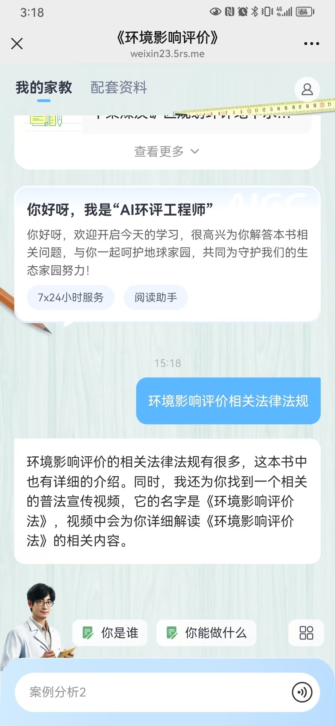 值得一提的是,本書不但附帶教學課件、各章習題及答案、在線課題、案例分析、法律法規等免費學習資源,還引入了“AI環評工程師”,可以實現7*24小時在線解答本書相關問題,可以稱為環境影響評價版“Deepseek”。